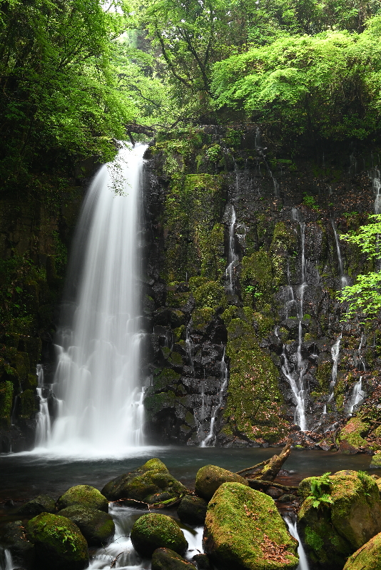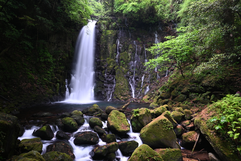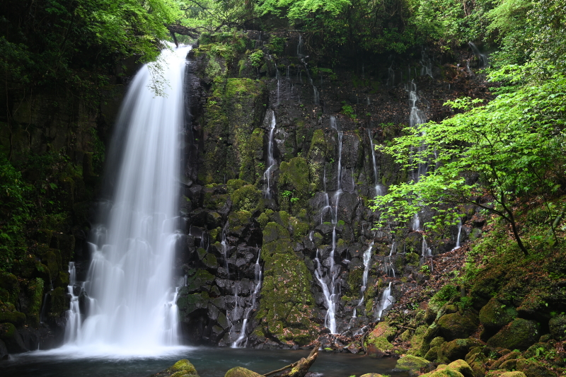 | 数十万年前の火山岩からなる滝。 溶岩が冷えて固まるときにできた規則正しい割れ目(柱状節理)が見られる。 別名「寄姫の滝」とも呼ばれ熊本県平成の名水百選に選ばれており、 落差約20メートルの滝で流れ落ちる水はまるで白い糸のように見える。 滝周辺は綺麗に整備されており、 GWなど時期によってライトアップイベントが行われる。 〜寄姫伝説〜 その昔、兵部という男が白糸の滝で雷雨に見舞われ雨宿りをしていた。 夕立が止んだそのとき現れた美しい寄姫に兵部は心を奪われ二人はめでたく結ばれます。 一方で、織物をすると言って出かける寄姫に巷では妙な噂が立ちます。 兵部は寄姫を問い詰めますが「知りませぬ」と答えるばかり。 怒った兵部は刀で寄姫の胸を一突きに。 寄姫は外へ逃げましたが、点々と続く血の跡を兵部がたどると 洞窟の中に血を流して横たわる大蛇の姿があったということです。 ※西原村観光協会HP参照 |