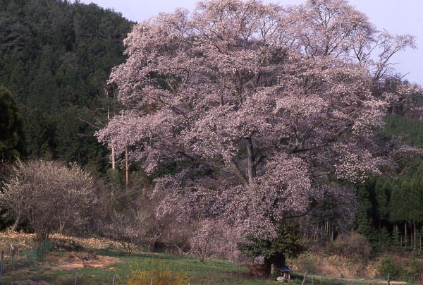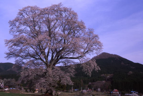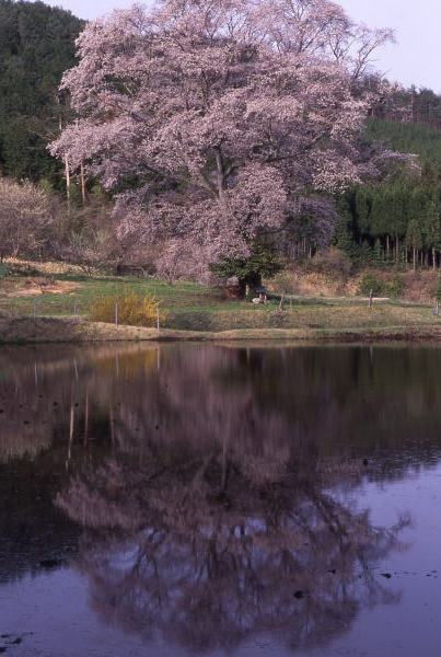| 千鳥別尺は標高650mの山に囲まれた小さな集落。 別尺山のふもとにあたるこの一帯は上千鳥村があり、荒神さんの神木として人々から守られてきたと伝えられており、 昔から“桜が咲けば田植えの時期”と言われている。 県天然記念物指定の第1号。全国的に国、県指定の天然記念物のヤマザクラは希少。 花は若葉と同時に開き、県内のヤマザクラでは最大。 樹齢:400年 根回り周囲:6.7m 胸高幹囲:4.6m 枝張り:東 9.0m 西12.2m 南10.2m 北12.0m 樹高:約27m 〜goodtimeの追想〜 2005年桜撮影もいよいよ終盤に向かい、東城の千鳥別尺の山桜撮影をゴールに決めた。 ライトアップ撮影が目的だったので時間潰しに小奴可の要害桜に経ち寄ってみたが見頃は少し過ぎていた。 ついでに森湯谷にも寄ってみたが、こちらは既に葉桜になっていた。 16時35分、千鳥地区へ到着。 夕方なのに相変わらずここは人が多くカメラマンもたくさん訪れている。 雑誌やテレビ効果で広島県で一番の1本桜スポットに定着してしまったようだ。 桜の満開に合わせてなのか、昨日の午後くらいに田んぼに水が張らたらしく、 田んぼに映し出された桜も美しかった。 昨年から幹の周りに咲いてあった菜の花が無くなってしまったので、 ちょっと寂しい気もするが、桜の美しさは今年も健在である。 |