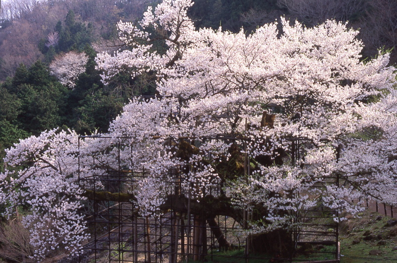 | 国の天然記念物に指定されている県下最大のエドヒガン桜。 樹高13.8m、幹回りは6.3m、樹齢は1000年を越えるともいわれ、 その昔、出石藩のお殿様が花見に訪れた桜の名所で、 地元の人々からは「仙桜」とも呼ばれている。 長年の風雪から樹勢が弱まり、大枝も枯れたり折れたりするなど枯死が危ぶまれたが、 地区の有志や樹木医の献身的な活動により治療を大規模に施し、近年では持ち直しつつある。 なお、治療と保護のため根元周りには柵や大枝を雪から保護するための櫓などが組まれている。 〜goodtimeの追想〜 竹田城跡周辺に霧が出ていたので、 ひょっとして樽見の桜周辺にも霧がかかっているかも?ということで、 竹田城跡を下山したら霧は殆ど残っていなかった。 7時30分、駐車場に到着。 朝の日差しも裏山で当たっておらず訪れる時間帯として午前より午後の方が良さそうだ。 地元のボランティア兼カメラマンが面白いことを言っていた。 「ここは霧の通り道だから雨が降ると霧が出やすい。 満開の今より満開前のピンク色が霧と対照的になって良い写真になる」 確かにエドヒガンは満開1週間前はピンク色になるが、 そういう撮り方もあったんだと勉強になった。 地元の人の協力で今年も綺麗な花を咲かせた大桜。 ジャングルジムの支柱で見栄えは悪いが人と自然が共存している姿も悪くは無い。 先祖代々守り続けてきた桜を今後も大切に見守っていって欲しいと願うばかりである。 |