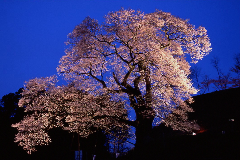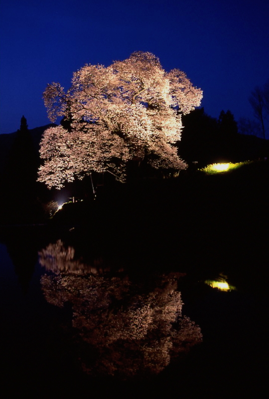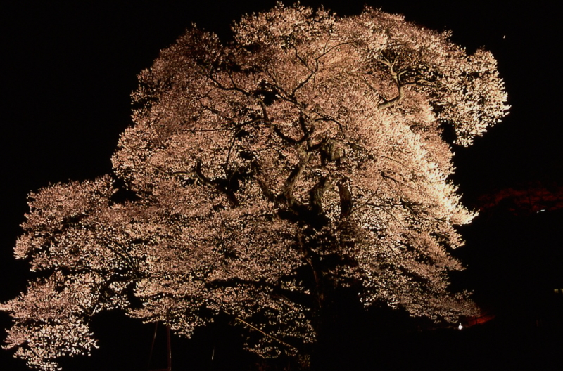 | このエドヒガンは東城町史跡である山城跡(亀山城跡)があり、西側の麓が居館跡と伝えられ、 その一角に本樹があるところから、地元の人々に「要害桜」の名で呼ばれている。 地元の人々に保護されてきたため県内有数の巨樹になったものとされています。 樹齢260年 根回り周囲:6.55m 目通り幹囲:5.7m 枝張り:東9.5m 西10.0m 南10.3m 北13.0m 樹高:約17m 〜goodtimeの追想〜 森湯谷から小奴可へ移動。 今年も菜の花は咲いていたが少し疎らのように感じられる。 遠い中国山脈はまだ日が当たっていたが小奴可はとっくに日陰。 早くもたくさんのカメラマンがライトアップ待ちをしていた。 まだ空が真っ暗にならない一瞬の時間がシャッターチャンスとなるので、 みなさん田んぼに写り込むベストポジションを確保されていた。 去年似たようなものを撮影済みなので今回は去年霞で狙えなかった構図に挑戦。 午後の暖かさに油断して薄着をしてきたが、 先週同様、春の夜を甘く見てしまいやっぱり寒い。 小奴可の街と要害桜が見える少し高い場所に機材をセットして撮影態勢を整える。 多くのカメラマンがいるなかでこの場所から狙う人は誰もいない。 近くにお墓があるだけにちょっと怖くていろんな意味で余計に寒さを感じる。 19時からライトアップだったが少し早い時間にライトが点灯。 残照で見える背景の山と点灯される小奴可の街並み。 まさにこの瞬間が混ざり合うのは一瞬のタイミングである。 ここに訪れて日が落ちれば当たり前のようにカエルの鳴き声が響く。 当たり前の音景色も年々と少なくなっていくが、ここは当たり前のように響く。 去年は、撮影が終わる頃には誰一人としていなかったが、 今日はまだまだカメラマンや花見客が残っていて、 東城の桜は年々人気を増しているようだ。 撮影を終えて機材を片付けて後ろを振り向くと知らない間に大きな満月が浮かんでいた。 |