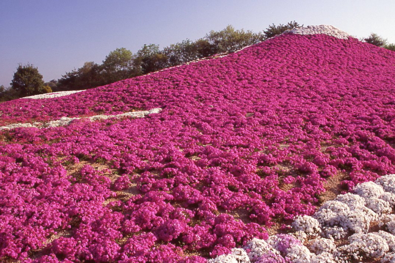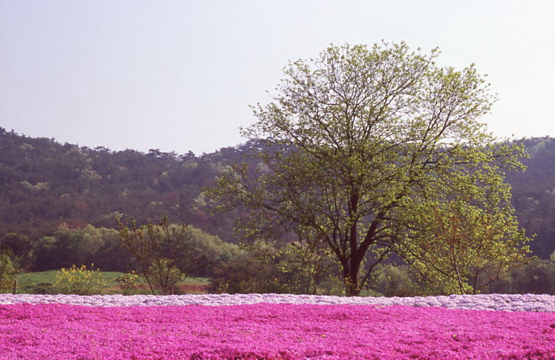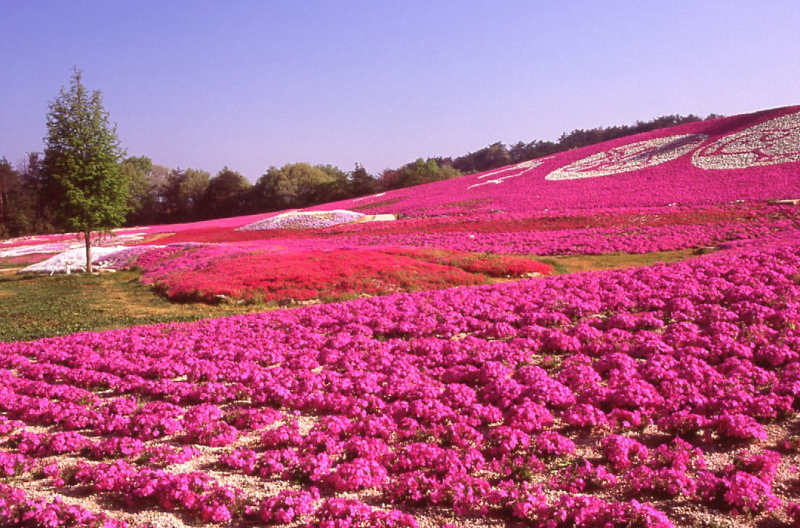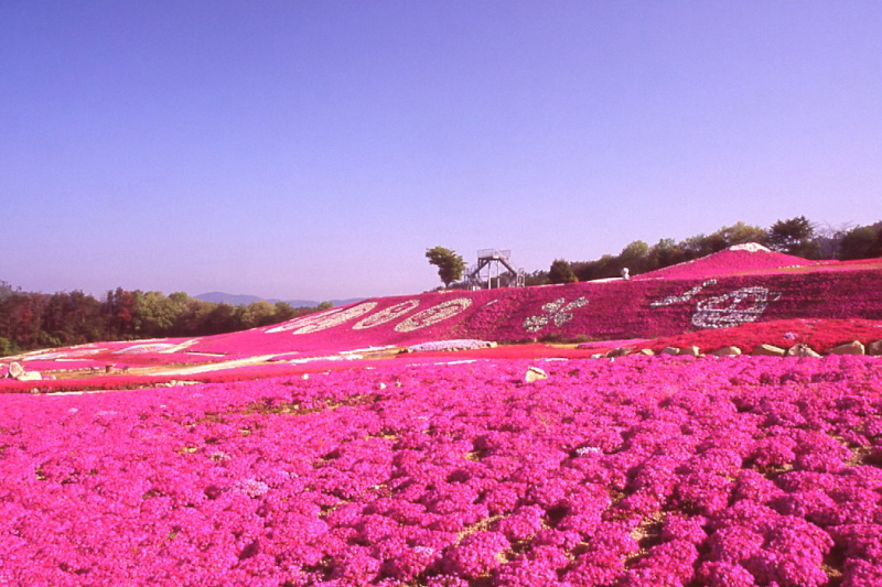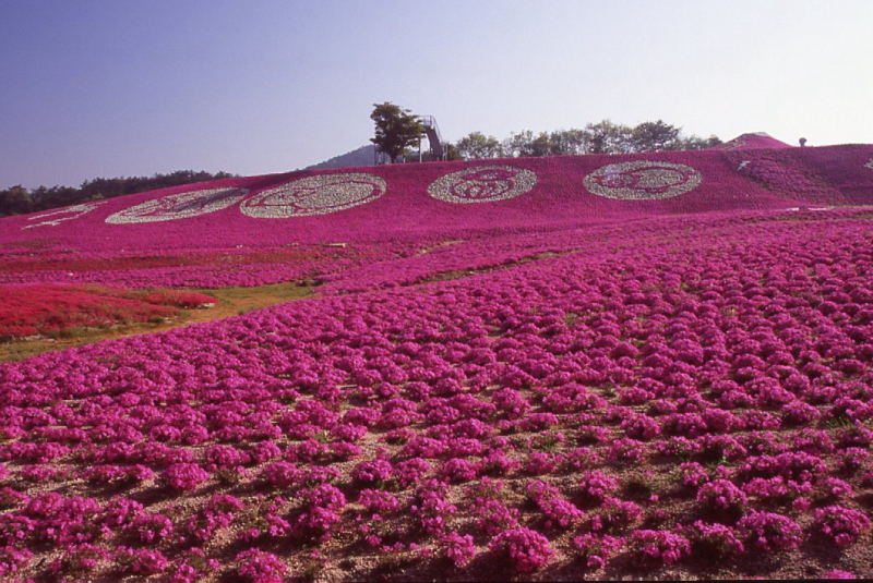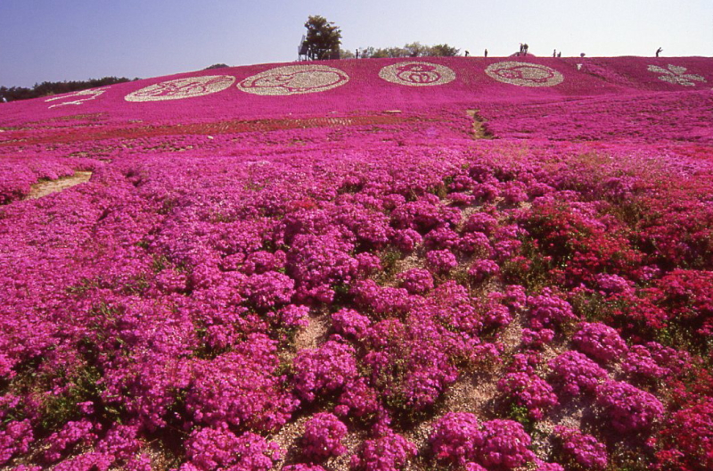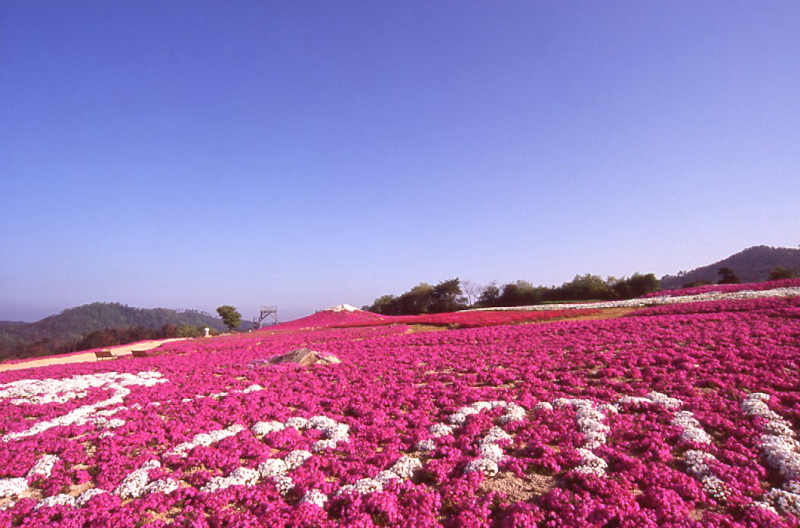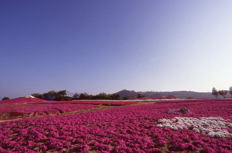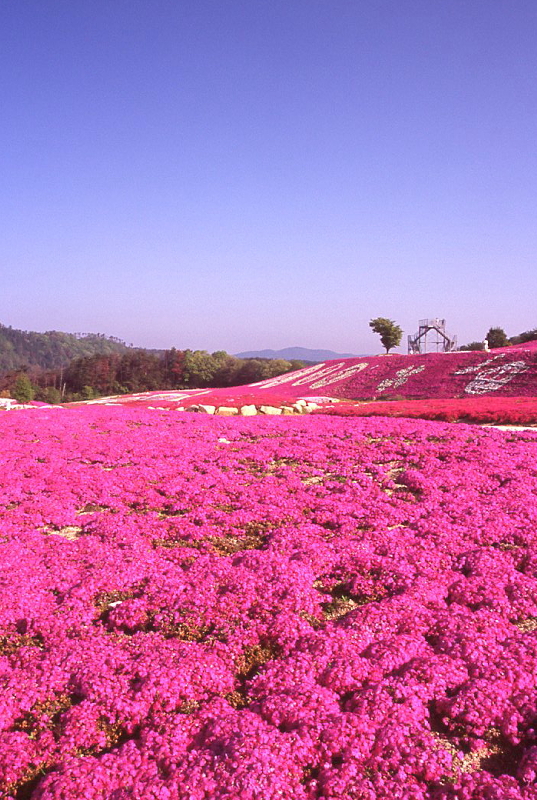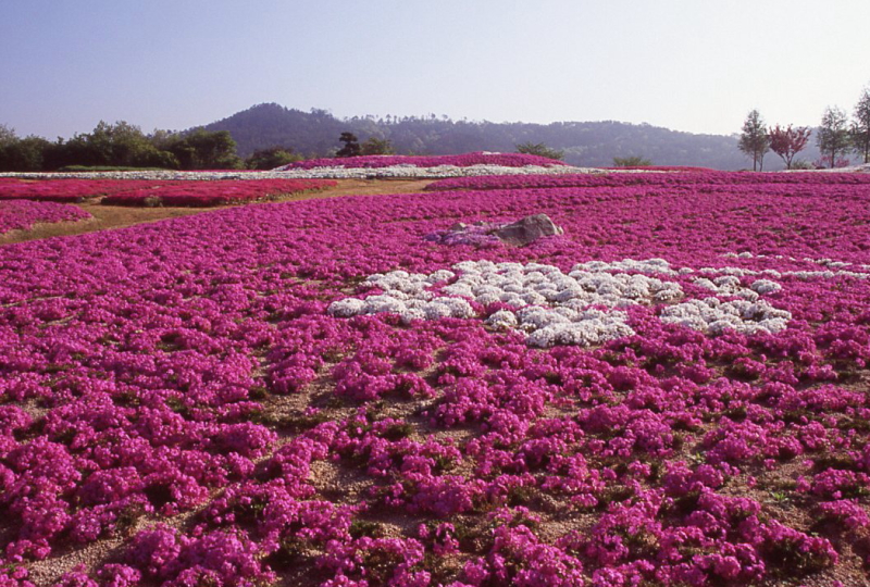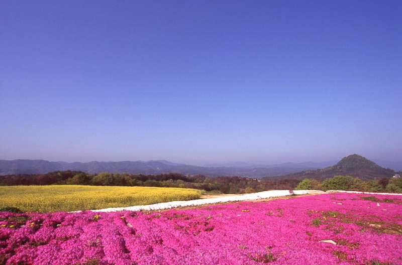 | 広島県東部にある世羅高原、標高480mにある30,000平方メートルの丘は、 一面見わたす限り西日本一の規模を誇る40万株の芝桜、県内初の本格的芝桜庭園。 光あふれる世羅高原に緑色の風が吹き抜け、木々の新緑も萌え出し野山は生気に満たされる。 園内には、芝桜の他に菜の花畑などもあり、芝桜の隙間からチューリップが顔を覗けていたりする。 世羅高原には、芝桜以外にも多くの農園がある。 〜goodtimeの追想〜 GW初日、朝起きて曇っていればのんびりするつもりだったが、 窓から射し込む日差しで今日の予定が決定した。 6時に家を出て1時間かけて花夢の里に到着。 広い台地に広がる芝桜。 部分的に草が目立つが一斉に満開にすると観覧時期が持たないので、 満開日をズラして公開日を長くするための対策なのだろう。 旭鷹農園も素晴らしいが花夢の里の魅力は何と言っても広大な台地が見渡せるところ。 もう少し冷え込めば薄っすら霧が出ていたかもしれない。 朝の日差しに輝く芝桜だけでも十分魅力のある場所で、 西日本一のスケールを誇る場所だけに多くの人が訪れるのもわかる。 |