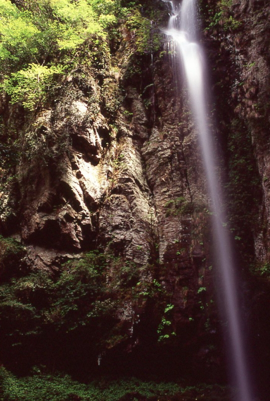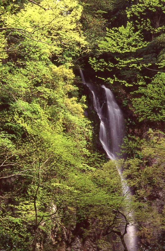 約42mの瀑布はうっそうと生い茂る樹林と調和している。